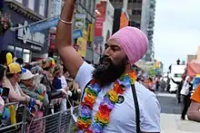Jagmeet Singh Jimmy Dhaliwal MP (/dʒəɡˈmiːt sɪŋ/ jug-MEET SING;[3] born January 2, 1979)[4][5] is a Canadian politician who has served as the leader of the New Democratic Party (NDP) since 2017. Singh has sat as the member of Parliament (MP) for Burnaby South since 2019.[6] He was elected to the Legislative Assembly of Ontario in 2011, representing Bramalea—Gore—Malton until his entry into federal politics.[7] A practicing Sikh of Punjabi descent, Singh is an Indo-Canadian, making him the first Sikh and first visible minority to be elected to lead a major federal political party in Canada.[8][9][10]