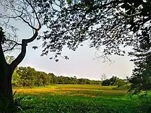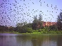 The university stands on the west side of the Asian Highway, popularly known as the Dhaka-Aricha Road, and is 32 kilometres away from the capital. Spread over an area of 697.56 acres (2.8 km2), the campus surrounded by the Bangladesh Public Administration Training Centre (BPATC) on the south, and the Savar Cantonment on the northeast, on the north of which is the National Monument (Jatiyo Smriti Soudho) and a large dairy farm on the east. JU is considered as the most beautiful university in Bangladesh. The topography of the land with its gentle rise and plains is pleasing to the eyes. The water features sprawled around the campus make an excellent habitat for the winter birds that flock in every year in the thousands and consequently, it is a site frequented by many bird watchers.[7] On 19 January 2017, the university arranged a bird fair in its Zahir Rayhan auditorium.[12] The Shahid Minar (martyrs' monument) of JU is the tallest in Bangladesh, 71 feet high and made of ceramic bricks on a base 52 feet in circumference. The height signifies the war of independence fought in 1971 and the circumference refers to the language movement of 1952. It is designed by architect Robiul Hossain.[13]