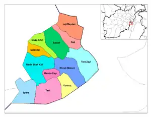 Jaji Maidan District shown in orange in the far north. The two "j" letters are pronounced as in the Chinese name Beijing.