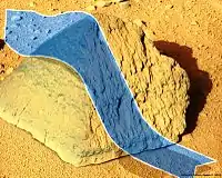 Analytical studies, performed on the rock by the Curiosity rover in October 2012, suggest the Jake M rock is an igneous rock but found to be high in elements consistent with feldspar, such as sodium, aluminum and potassium, and lower concentrations of magnesium, iron and nickel than other such rocks previously found on Mars.[4] The mineral content and elemental abundance indicates Jake M rock may be a mugearite, a sodium rich oligoclase-bearing basaltic trachyandesite.[5] Igneous rocks similar to the Jake M rock are well known but occur rarely on Earth. On Earth, such rocks form when magma, usually found in volcanoes, rises to the surface, cools and partially solidifies with certain chemical elements, while the warmer liquid magma portion becomes enriched with the left-behind elements.[4] By remarkable coincidence, the Martian locality Glenelg is also the name of a small settlement in north-west Scotland that is 25 km (16 mi) east of type locality for mugearite at Mugeary on the island of Skye.[5] The Jake M rock is a ventifact with a volcanic fabric.[6] Its pyramidal shape was formed by eolian drifted grains of sand. The little cavities on its surface were formed by the blast-effect, which is caused by different flow dynamics at the micro-relief.[6] On the surface one could see the marks of the main wind direction, by which Jake M was formed.[6] On September 27, 2013, NASA scientists reported that Jake M rock was a mugearite and very similar to terrestrial mugearite rocks.[7][8][9][10]