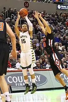Brunson opened the season in the starting lineup with 12 points and 4 assists against the Fairleigh Dickinson Knights on November 13.[69] On November 26 in the semi-finals of the NIT Season Tip-Off against Stanford, Brunson posted 18 points.[70] On December 28, he posted a then career-high 22 points against Penn.[71][72] The 22-point effort was part of a 3–0 week for Villanova in which Brunson averaged 15.3 points and earned Big East Freshman of the Week.[73] On February 8, the 2015–16 Wildcats became the first Villanova Wildcats men's basketball team to reach number one in the AP Poll by climbing to the top of the 2015–16 NCAA Division I men's basketball rankings.[74] Following the 2015–16 Big East season, he was a unanimous Big East All-Freshman Team selection.[75] In the 2016 NCAA Division I men's basketball tournament regional final against Kansas Brunson made the final two free throws that gave the Wildcats a two-possession lead with 3.5 seconds left.[76] The 2015–16 Wildcats won the championship game of the tournament by defeating the North Carolina Tar Heels 77–74, with Brunson as a starter.[77][78]