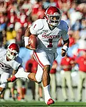 In his first game as a Sooner on September 1, 2019, Hurts shattered Oklahoma's single-game yardage record in a debut (previously held by Baker Mayfield when he put up 396 yards of total offense against Akron in 2015), putting up 508 yards of total offense against Houston.[25] On September 28, in a 55–14 victory over Texas Tech, he had 415 passing yards, three passing touchdowns, and one interception to go along with nine carries for 70 rushing yards and a rushing touchdown.[26] Hurts helped lead Oklahoma to a 7–0 start to the season. The team's first setback came against Kansas State on October 26. In the 48–41 loss, Hurts passed for 395 yards and a passing touchdown to go along with 19 carries for 96 rushing yards and three rushing touchdowns.[27]
