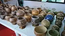 There is no major industry in the municipality except for the Mecoacán oil field. Manufacturing is limited to handcrafts and food processing by small family businesses.[1] One known food industry here is the production of cured meats such as head cheese and longaniza sausage.[4] The main local handcraft is the drying and decoration of gourds which were traditionally used for storage and food service, but today are mostly created for tourists.[1] The gourd, called a jicara, is traditional important as a vessel for chocolate. Today, it is still traditional to serve a chocolate drink called pozol in these gourds.[6]
