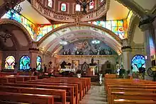 The San Francisco de Asís Church is next to the plaza in the center of the city. It was restored recently.[1] The church's facade is Neoclassical made of sandstone flanked by two bell towers.[5][6] The interior is single nave with two main sections and a cupola in the center of the roof. One of the decorative features of the church is five doves in different colors, which symbolize five continents. In front of the church is a wide atrium with benches, lights and garden areas along with fountain which used to be a baptismal font.[6]