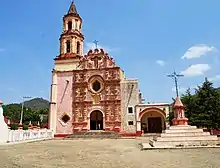 The municipality has two of the five Franciscan missions accredited to Junípero Serra during his evangelization of the Sierra Gorda. These missions were declared a World Heritage Site in 2003.[2] One is located in the town of Jalpan proper and the other is located in the community of Tancoyol. The mission in Jalpan was constructed between 1751 and 1758 and dedicated to Saint James the Greater, as defender of the faith. It was the first of five missions built to evangelize the area. The main portal is dominated by various forms of plants most local to the region. European elements include images of saints and the Franciscan coat of arms. Native elements include a double headed eagle with a snake as well as an image of the Virgin of Guadalupe.[2][9]