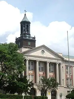 By that year, accusations were already made towards Gompert of faulty construction and inferior material use at the new high school and other new schools under his watch.[41][42] The new Jamaica High School building was opened February 1, 1927.[43] It was officially dedicated May 12, 1927.[7][8] The school cost $3 million to construct.[7][25] At the time of construction, the school building was the largest in the United States.[13][31]