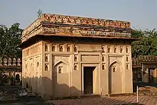 The tomb of Jamali-Kamali is a decorated 7.6 m (25 ft) square structure with a flat roof, located adjacent to the mosque on its northern side. Inside the chamber, the flat ceiling is plastered and ornately decorated. It is painted in red and blue with some Koranic inscriptions, and the walls are adorned with inlaid coloured tiles inscribed with Jamali's poems. The decorations in the tomb have been described as giving the impression of "stepping into a jewel box". In the Jamali Kamali Mosque and Tomb the tomb chamber has two marble graves: one of Jamali, the saint poet and the other of Kamali. The reason for the Kamali name could probably be that it rhymes well with Jamali.[1][4]