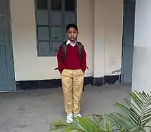 1. White half-sleeve shirt 2. Khaki full pants 3. White shoes 4. Maroon sweater 5. School badge iwith monogram (attached to the left pocket of the shirt)