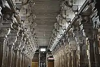 [3][7] The massive outer wall covering the fifth precinct, known as the Vibudi Prakara, stretches over a mile and is two feet thick and over 25 feet high. Legend maintains that the wall was built by Shiva working with the laborers.[2] The fourth precinct contains a hall with 796 pillars and measures 2436 feet by 1493.[8] It also has a small tank fed by perpetual springs.[7] The third enclosure is 745 feet by 197 surrounded a wall 30 feet high. This area has two gopurams (gateway towers) 73 and 100 feet tall, a coconut thoppu and a small water tank.[8] The second enclosure is 306 feet by 197, a gopuram 65 feet high and several small shrines.[8] The inner most enclosure measuring 126 feet by 123 has the sanctum.[8]