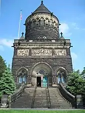 The tomb was designed by architect George Keller[11] in the Byzantine, Gothic, and Romanesque Revival styles.[12] All the stone for the monument came from the quarries of the Cleveland Stone Company, and was quarried locally.[13] The exterior reliefs, which depict scenes from Garfield's life,[11] were done by Caspar Buberl. Its cost, $135,000 ($4,100,000 in 2021 dollars), was funded entirely through private donations.[14] Part of the memorial's funding came from pennies sent in by children throughout the country.[15]