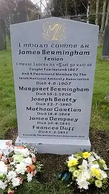 James Bermingham died on 4 June 1907 at Jervis Street Hospital, Dublin. His funeral from University Church, St. Stephen's Green,[11] to Glasnevin Cemetery was a large public event. Many of his old Fenian comrades were present along with a number of Nationalist members of parliament, Trade Union representatives and Dublin City Council officials and public representatives.[12] He was laid to rest beside his wife Margaret who died during the previous year.[13]