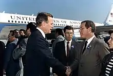 Smith started out as a Democrat in his political career. He became Florida Attorney General in 1979, succeeding Robert Shevin, and he served in this capacity until 1987. In 1986, he ran for Governor of Florida. The Democratic primary was initially a three-man race, with Smith facing Senate President Harry Johnston and Florida Representative Steve Pajcic. During the primary campaign, Smith pledged to support the eventual Democratic nominee. [3] Smith and Pajcic survived the first round of the primary, and the widespread assumption was that Johnston, whose political beliefs were more closely aligned with Smith's than Pajcic's, would endorse Smith in the runoff primary. However, Johnston came out and endorsed Pajcic because, he said, Smith was running dishonest ads falsely linking Pajcic to pornographers and homosexual marriage. In the runoff primary, Smith narrowly lost the Democratic runoff to Pajcic, and then bitterly refused to campaign for Pajcic,[4] despite his earlier pledge to support the party's nominee. Smith's snub of Pajcic was rewarded by victorious candidate Bob Martinez, who placed Smith on his transition team[5] and appointed Smith to the position of Secretary of State of Florida.[6]