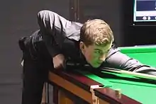 In the first round of the championship, Cahill drew world number one and five-time champion Ronnie O'Sullivan. Cahill led 5–4 after the first session of the match and won three of the four frames at the start of the next session to lead 8–5. O'Sullivan won the following three frames to tie the match at 8–8 before Cahill won the final two frames and the match 10–8.[39] After beating O'Sullivan, Cahill commented "I am over the moon, to beat the best player in the world and hold myself together on my Crucible debut."[40] The match was referred to as the "biggest shock in Crucible history" by the British Broadcasting Corporation, with master of ceremonies Rob Walker introducing him as "the giant killer" for having defeated two world number ones as an amateur.[41][42][43]
