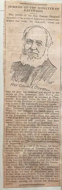After a "distinguished career" at the University of Edinburgh, Campbell went to Rosneath as an assistant clergyman to Rev Robert Story, the father of the Principal of Glasgow University, and in that parish was the driving force behind the erection of a chapel at Craigrownie which later functioned as a parish church.[9] In 1853 he was ordained to Eastwood, the parish he served for more than five decades until his death. In his time a new manse, church, and parish school were erected.[10]>[11] At his induction, Sir John and Lady Matilda Maxwell, George Campbell's patrons, treated him to a "sumptuous banquet" at the Star Hotel, Glasgow, in the presence of numerous clergymen, the service having been conducted by the Rev Andrew Watson of the Abbey, Paisley.[12] Months after his induction, Campbell advertised for a parish schoolmaster for the growing district, "competent to teach all the branches of an English Education, together with Latin and Greek, and at least one Modern Language." A "maximum Salary" was offered for the strenuous position, to which were added duties as the parish's Session Clerk.[13] In 1855, not long after he had started out as a minister, thieves forcibly broke into Eastwood manse and stole a large amount of silver plate and other items, including silver sacramental cups belonging to the church.[14]