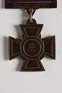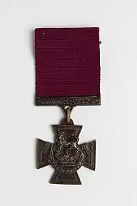 Crichton was awarded the Victoria Cross (VC) for his deeds of 30 September 1918.[1] The VC, instituted in 1856, was the highest gallantry award that could be bestowed on a soldier of the British Empire.[10] The citation for his VC read: