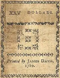 The numerous laws against counterfeiting during the years leading up to the American Revolution indicates that this activity occurred often enough in the colonies to warrant their numbers.[35] Several colonies, including Virginia and North Carolina, regarded counterfeiting as an act of treason, where the penalty of death was provided.[36] In 1768 Davis was again commissioned by the North Carolina General Assembly to print £20,000 in paper notes. When counterfeit notes turned up in 1770, printed with the same type Davis had used in 1768, Davis and the two men who had assisted him in the printing, James Mansfield and Samuel Robert Hall, were interrogated by the North Carolina colonial authorities. The counterfeit notes were so well printed that it was assumed by some that the notes were printed either in Williamsburg, Virginia, or in Davis' own printing shop in New Bern. Davis pointed out that when his shop was destroyed in the hurricane of 1769 he had lost sufficient type for someone to reproduce the notes. The investigation, however, failed to establish any culpability involving Davis and his printing shop. Davis soon faced another challenge to his reputation in 1773. Spencer Dew, convicted of a litany of counterfeiting and thievery crimes, and facing execution, accused Davis of printing and giving him £1,000 in counterfeit notes, and that Davis had also given £2,000 in bogus notes to James Coor, a prominent New Bern resident.[37] It is unclear if Dew's allegations[lower-alpha 7] were an attempt to discredit Davis, who was also the North Carolina justice of the peace, but the allegations could not be substantiated and the long time established reputations of Davis and Coor remained intact. Davis was reappointed public printer in 1774 and continued to serve as Justice of the Peace in New Bern until 1778.[39][40]