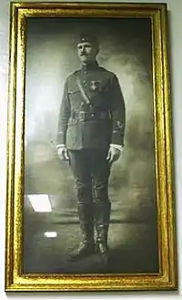 Having been active in the Cadet Corps while at the University of Missouri, Rieger joined the Missouri Militia as a private soon after returning to Kirksville and establishing his law practice.[2] He was instrumental in the formation of the Kirksville Company C in January 1900 and was elected an officer, and later commander, of Company C of the Fourth Regiment. In 1916 now-Major Rieger and the 2nd battalion, 4th Regiment joined a fellow northeast Missourian, General John J. Pershing on the Mexican border in pursuit of bandit Pancho Villa.[1] Following the United States' entry into World War I, the Missouri Militia was mustered into federal service on August 5 and combined with units from Kansas to create the 35th Infantry Division.
