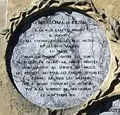 Many memorials were erected to him by the king, Prince Henry, and others.[22] He was immortalised in song as Feldmarschall von Keith in the ballad "Fridericus Rex" by Willibald Alexis, which was set to music by Carl Lowe in 1837 and became the basis in the 1860s for Ferdinand Radek's Fridericus Rex Grenadier March[28] in which his surname is mispronounced as "Kite." He is memorialised on the Equestrian statue of Frederick the Great (1851). In 1889, the 22nd Infantry Regiment (1st Upper Silesian) was named after him. Hochkirch erected a stone tablet inscribed to Keith outside its church, to stand with others dedicated to the victims of Prussia's defeat by Austria on 14 October 1758. There is also a statue to Keith in Peterhead, Aberdeenshire, which was given to the town by William I, King of Prussia, in 1868.[29]