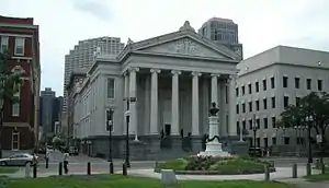 After leaving the Dakins, Gallier found his services were in high demand, as the city's population had expanded between 1830 and 1840 from 46,082 to 102,193. Areas upriver from Canal Street were being developed as the home for English speaking Americans and Irish immigrants.[9] In this now-central part of New Orleans, which stretches from Canal Street to the Garden District, Gallier was commissioned to build a new structure housing many municipal services for this district, one of three "municipalities" that the city had been effectively divided into in an effort to reduce tensions between the different ethnic groups of Creoles, Anglophones, French, Spanish, and Free People of Color, an arrangement that soon proved unworkable. Nonetheless, when the various districts were abolished and city government reunited, Gallier's new building, a large porticoed Greek-Revival structure located on Lafayette Square and completed in 1853, became the new City Hall. Later named after him as Gallier Hall, it served in the same capacity for more than a century, before relinquishing these duties to the present New Orleans City Hall in 1957.[14] The building is mostly constructed of brick, scored to look like stone, with only the façade made of marble and granite; even so, the building costs totalled $342,000 ($12.9 million in 2021).[15] The Ionic order, especially the column capitals of the portico, were modelled on the Erechtheion on the Athens Acropolis.[4]