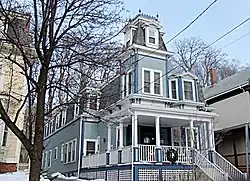 The James H. Brooks House stands in a residential area of the city's Prospect Hill neighborhood, on the north side of Columbus Avenue. It is west of the main access to Prospect Hill Park, and its rear property line abuts the park. Set on a narrow lot, it is a 1+1⁄2-story wood-frame structure, with a mansard roof and clapboarded exterior. Its roof pierced by dormers, including an elaborate projecting dormer on the right side of the front facade. It has a tower rising three stories on the left side; it is topped by a steep mansard-style roof, also with gable dormers, that is surmounted by an iron crested railing. The first floor porch is supported by turned pillars on tall square piers, with paired brackets in the eaves.[2]