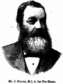 - "J Hayes MLA for The Hume". Australian Town and Country Journal. 10 September 1887. p. 10. Retrieved 11 July 2021 โ via Trove.
