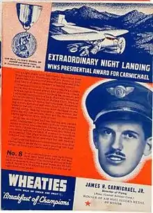 In 1935 he was recommended by the President of the Air Line Pilots Association, Dave Behncke, and was awarded the Airmail Flyers Medal of Honor for safely landing an aircraft with six passengers after an engine fell off, smashing one landing wheel and damaging a second engine over Hancock, Maryland. Carmichael, nicknamed "Slim" due to his tall slender build, became one of only 10 pilots to receive the medal and was number 8 in a series of 8 box covers on the popular breakfast cereal Wheaties.[3]