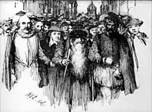 On account of Lawson's denunciation in the pulpit of the acts of the parliament of 1584 — which were supposed to interfere with the jurisdiction of the kirk — Arran vowed that "if Lawson's head were as great as an haystack, I shall cause it to leap from his hawse [throat]."[18][19] For this he was compelled to fly, and accompanied by Balcanquhal, sought refuge at Berwick, 27 May 1584. Always a man of melancholic mood, he was so affected by the troubles of the times and the unworthy conduct of some of his flock that he resolved to leave the country altogether, and make his home in England. Arrangements were made for his arrest on 28 May, but on the 27th he escaped to Berwick, proceeding thence to London. When his flight and that of Walter Balcanquall became known an act was passed by the privy council declaring that they had left their charges void ' against their duties and professions,' and appointing other ministers to preach in their stead (Reg. Privy Council Scotland, iii. 668). During their absence their wives addressed a long joint letter of rebuke to the Bishop of St. Andrews, in which they likened him to Chaucer's cook, who 'skadded' (i.e. scalded) his 'lips in other men's kaile'[20] Not long afterwards the magistrates were charged to dislodge the ladies from their dwellings.[21]