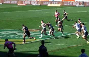 In Round 1 of the 2010 NRL season, Maloney made his club debut for the New Zealand Warriors against the Gold Coast Titans, playing at five-eighth in the 24–18 loss at Robina Stadium.[10] In Round 3 against the Brisbane Broncos, Maloney had an outstanding match by scoring a hattrick of tries that were his first NRL career tries and kicked 8 from 8 goals, finishing the match with 28 points in the 48–16 victory at Suncorp Stadium.[11] Maloney had a breakthrough 2010 NRL season, scoring 188 points with 10 tries, 73 goals and 2 field goals in 24 matches in his first full NRL campaign. It put him in contention for Dally M recognition and he was on the shortlist for the standoff of the year at the Rugby League International Federation's awards.[12] On 26 September 2010, Maloney made his representative debut, playing for Prime Minister's XIII to play Papua New Guinea playing at five-eighth and kicking 1 goal in the 30–18 win at Port Moresby.[13]