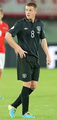 McCarthy received his first call-up to the Republic of Ireland national squad in February 2010, for a friendly with Brazil played in London.[44] He made his debut as a substitute, replacing Stoke City's Liam Lawrence after 70 minutes.[45] McCarthy withdrew from the Ireland squad for their 2011 Nations Cup match against Wales.[46] This led to media speculation that McCarthy may switch his allegiance to Scotland, as his appearance in the friendly against Brazil did not tie him to Ireland under the present rules.[47] The speculation was fuelled by Wigan manager Roberto Martínez who insisted that McCarthy was still considering his international future, even after McCarthy and Giovanni Trapattoni had a face to face meeting in which McCarthy reportedly confirmed his commitment to Ireland.[48]
