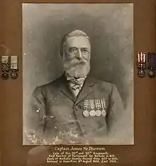 McPherson was born into a Highland family in 1831/1832.[1] He arrived in New Zealand on the Calcutta in May 1861 as Ensign of the 70th Regiment with his wife and two children.[2] Later, he was paymaster in the Commissariat Transport Corps. In July 1864, he received his commission as captain and joined the 4th Waikato Regiment.
