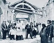 On San Carlos Day, November 4, 1879, Scottish novelist Robert Louis Stevenson visited the Carmel Mission to hear the a mass at the church that had fallen into disrepair. A drawing by Joseph D. Strong shows Jules Simeenau, Meadows and his wife, and Father Angel Delfino Casanova standing in front of the church.[18]