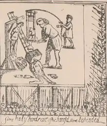 Early in 1674 he was recognised in the street by Sharp, whose brother, Sir William Sharp, obtained a confession from him, after the archbishop had pledged himself that no harm should come to him. But he was imprisoned at the Bass Rock,[7] and, at the instigation of Sharp, brought before the council on 10 February 1674. He made a full confession on 12 February on receiving a promise of his life. Mitchell was indicted before the High Court of Justiciary and sentenced to have his right hand cut off by the common executioner, at the "Mercat Cross" of Edinburgh.