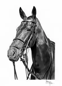 England's BBC London News program reported in a 2014 interview that James Mylne sold his first work of art when he was nineteen years old.[8] Exhibitions of his ballpoint drawings began in 2001.[2] In his photorealistic artworks, subject matter has included wildlife (shown at right), urban landscapes and the female form.[2][9] Mylne's ballpoint pen replicas of iconic photos of entertainers and artists from Britain and America, including Audrey Hepburn and Jean-Michel Basquiat, were the first to attract attention.[10] Hepburn became a recurring "muse".[1]