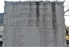 Soon after the Prestons and Pattons arrived, James Patton invited the Presbyterian minister James Anderson to deliver a sermon in his home. In 1740, a permanent preacher, John Craig, settled in the area. Patton and three other men were elected commissioners of the Tinkling Spring congregation in 1741, according to the monument at Tinkling Spring Presbyterian Church. In 1742, Patton underwrote the cost of construction of the Tinkling Spring Meeting House in Tinkling Springs (present-day Fishersville),[22] one of the first recognized churches in the Shenandoah Valley.[23] Initially a one-room log structure, it took nearly three years to finish, with some controversy between Patton and his uncle John Lewis over where it was to be located. The first service was held there on 14 April 1745, when the Reverend Craig wrote: "This being the first day we meet at the contentious meeting-house, about half-built." The log structure was replaced by a stone building in 1790.[24]: 81 Patton's rivalry with his uncle continued for years afterwards. The Reverend John Craig wrote: "...a Difference happened between Col. John Lewis & Col. James Patton, both Living in that Congregation, which Continued while they Lived, Which of them Should be highest in Commission & power."[7]: 13