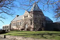 Constructed by architect A.J. Warner of Rochester, the building had a Richardsonian Romanesque design with rounded arches, Medina sandstone exterior, and turret on the southeast corner. Mary Prendergast specifically dictated that the steps entering the building on the south side be cut from a single stone and that the library be surrounded by a rock wall on three sides.[18][19]
