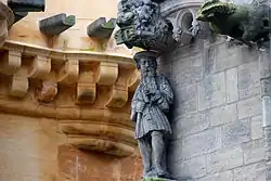 James V spent a large amount of money (at least £41,000) during his adult reign on extensively remodelling all the major residences and several minor ones, including the construction of new structures, with the most significant work focused on Falkland Palace and Stirling Castle.[35][36] Early in his personal rule James began the construction of the present Late Gothic James V Tower at the north-west corner of the Palace of Holyroodhouse, which provided new royal lodgings on the first and second floors, and a high degree of security. A new west front was also built.[37][38] At Linlithgow Palace, James closed off the original east entranceway and formed a new formal access from the south, including an inner gatehouse and an outer entrance gate decorated with the carved arms of the four chivalric orders of which James was a member: Garter, Thistle, Golden Fleece and Saint Michael. The three-tiered octagonal King's Fountain topped by an imperial crown was built in 1538 as the centrepiece of the courtyard.[39]