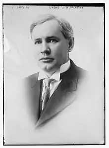McCarter, James W. (b. 1872) — of Ipswich, Edmunds County, S.Dak. Born in Jarvis, Ontario, July 29, 1872. Democrat. Lawyer; county judge in South Dakota, 1910-13; candidate for Governor of South Dakota, 1914; candidate for U.S. Representative from South Dakota 2nd District, 1918. Presbyterian. Member, Modern Woodmen of America; Ancient Order of United Workmen. Burial location unknown.