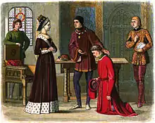 While comparatively young, however, Doyle abandoned the profession of an artist and devoted himself to historical studies. For his own edification he compiled a 'Chronicle of England' from B.C. 55 to A.D. 1485, which he adorned with numerous illustrations in colours. It received considerable praise from various persons to whom it was afterwards submitted, among others from the prince consort, and was well received by the public when published in 1864 (London, 12mo). Doyle's illustrations were engraved and printed in colours by Edmund Evans.[4]