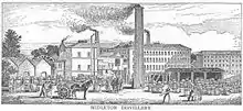 In 1886, Alfred Barnard, a British historian visited the distillery, describing its location close to both rail and water carriage, amidst large corn-growing country as a desirable location to establish a distillery.[2] In addition to the 31,618 gallon wash still, Barnard stated that the distillery boasted two 10,000 gallon spirits stills, and unusually for an Irish distillery at the time, a Coffey Still.[2] The distillery, which was lit by gas, was reported to have an output in excess of 1,000,000 gallons per annum, and to produce a whiskey known as "The Cork Whisky Make".[2] In later years, whiskey from the distillery was known as Cork Distilleries Company Old Irish Whisky, before becoming known as simply "Paddy".