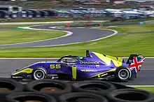 Chadwick moved into single-seater racing in 2017, joining Double R Racing to compete in the 2017 BRDC British Formula 3 Championship. She achieved her first and only podium of the season with a third place finish at Rockingham in the fifth round of the championship, ultimately finishing ninth overall for the season.[13] For the 2018 season, Chadwick remained in the BRDC British Formula 3 Championship, moving to Douglas Motorsport. In August, she became the first ever woman to win a British F3 race by claiming victory in the reversed-grid race at Brands Hatch, and finished the season in eighth place.[14]