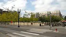 The square includes four 30-foot modern totem poles, created by Kenny Scharf and Paige Powell in 2001, named Tikitotmoniki Totems.[14][15][16][17][18] The Oregonian lampooned the art in late 2002, saying "the Pearl Arts Foundation commissioned '80s art star Kenny Scharf to put up goofy Tiki Totems" in the park.[19] However, the totem poles are also functional, as they hide steel support poles for the overhead trolley wires that supply power to the Portland Streetcar, which began operation in 2001. The Portland Streetcar passes on two sides of the park.[7]