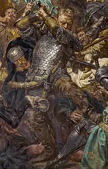 According to the Polish chronicler Jan Długosz,[16] in the following year (1410) Žižka served as a mercenary during the Polish–Lithuanian–Teutonic War. It is assumed that he was on the winning Polish-Lithuanian side of the Battle of Grunwald, also called the 1st Battle of Tannenberg, one of the largest battles in Medieval Europe.[17][18] It was fought on 15 July 1410, and the alliance of the Kingdom of Poland and the Grand Duchy of Lithuania, led respectively by King of Poland Jogaila (Władysław II Jagiełło) and Grand Duke Vytautas (Witold), decisively defeated the Teutonic Knights, led by Grand Master Ulrich von Jungingen. Most of the Teutonic Knights' leadership were killed or taken prisoner. The Knights never recovered their former power and the financial burden of war reparations caused internal conflicts and an economic downturn in their lands. The battle shifted the balance of power in Eastern Europe. Długosz reports that after the battle, Žižka was serving in the garrison of the town of Radzyń.