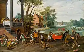 Jan Breughel the Elder had contributed to the development of the genre of the 'monkey scene', also called 'singerie' (a word, which in French means a 'comical grimace, behaviour or trick').[19] Comical scenes with monkeys appearing in human attire and a human environment are a pictorial genre that was initiated in Flemish painting in the 16th century and was subsequently further developed in the 17th century.[20] Monkeys appear in medieval cathedral sculpture as symbols of evil, while in Renaissance art they were a personification of man.[21] Monkeys were regarded as shameless and impish creatures and excellent imitators of human behaviour. These depictions of monkeys enacting various human roles were a playful metaphor for all the folly in the world.[22] Painters could use the figure of the monkey to express moral judgement and dubious traits of human behaviour.[21]