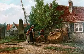 Most of his early works are in a style resembling his father's. Later, in 1864, he moved to Hilversum, where he came under the influence of the Laren School, then adopted stylistic elements from the Hague School. As a result, he came to favor relaxed scenes from the lives of fishermen and their families, rather than dramatic ocean views with ships.