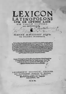 During his studies at Zurich Mączyński began work on a Polish-Latin Dictionary. In 1564 he moved to Königsberg (Królewiec) where he published his dictionary, which was later edited by Jan Sandecki-Malecki. The dictionary "Lexicon Latino Polonicum Ex optimis Latinae Linguae Scriptoribus Concinnatum” ran 1000 pages and contained 20,500 Latin terms, including idioms and jargon, and their Polish equivalents.[2] In Poland the dictionary was considered an important contribution to classical studies and was referred to as the Mączyński Dictionary. The Polish poet, and Mączynski's contemporary and friend, Jan Kochanowski, wrote an epigram (in Polish a fraszka, a short satirical poem) about the dictionary.[9][10] However, because only 500 copies were printed, the price of the dictionary was high, and the fact that Mączyński was a Protestant, the impact of the dictionary on the written Polish language was limited.[2]