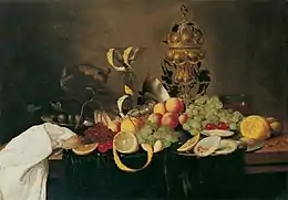 His fruit still lifes of fruit and flowers were typically of a large format. A few were created on a smaller scale and were popular among contemporary collectors as cabinet pieces. An example is the Still life with lemons, grapes, a pipe and filleted fish (At Dorotheum Vienna on 9 April 2014, lot 566). This signed work shows that in the small format Gillemans preferred narrow views that put the focus on meticulously described objects.[8]