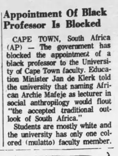 In 1968, he was directly involved in the Mafeje affair as he opposed the hirring of Archie Mafeje as a senior lecturer to University of Cape Town (UCT) telling the UCT Council about the[3][4]