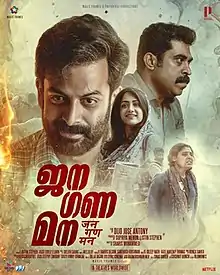 Jana Gana Mana (transl. The Minds of All People) is a 2022 Indian Malayalam-language legal thriller film directed by Dijo Jose Antony and starring Prithviraj Sukumaran, Suraj Venjaramoodu, Pasupathi Raj, G. M. Sundar, Mamta Mohandas, Sri Divya. The film was released on 28 April 2022[3] which received positive reviews for narrative style, cast performances and technical aspects.[4]