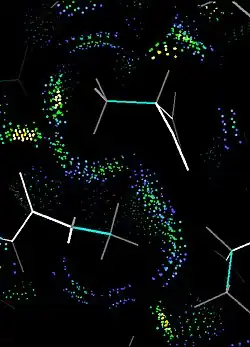 The Richardsons' more recent work has diversified beyond classification and crystallography. In the 1980s they stretched into the fields of synthetic biochemistry and computational biology as pioneers in the de novo design of proteins, a reverse engineering approach to make and test theoretical predictions about protein folding.[27] In the 1990s the Richardsons developed the kinemage system of molecular graphics and David Richardson wrote the Mage program to display them on small computers, for the then-new journal Protein Science.[28] Additionally, they developed all-atom contact analysis (see image) to measure "goodness of fit" inside proteins and in interactions with surrounding molecules.[4] The Kinemage website offers interactive exploration of various 3D protein structures through computer displays using their Mage or KiNG graphics programs. Funded by a National Institute of Science (NIH) grant, the website is often used as a teaching tool. Textbooks and internet sites that have sourced images from Kinemages include Introduction to Protein Structure by Branden & Tooze,[29] Fundamentals of Biochemistry by Viet, Voet & Pratt,[30] Principles of Biochemistry by Horton et al.,[31] and the University of Mississippi's Kinemage Authorship Project.[32]