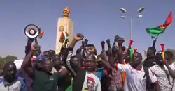 On 25 January, a large crowd gathered in the capital Ouagadougou's national square and celebrated the coup, playing music, singing, blowing horns and dancing.[44] BBC News senior Africa correspondent Anne Soy said the news of the president's detention was received with cheers and celebrations in Ouagadougou.[45] A Reuters reporter saw a group burning a French flag, which Reuters described as "a sign of growing frustration about the military role the former colonial power still plays in the region." The reporter also said he saw Russian flags dotting the crowd, and heard several demonstrators calling on Russia to replace France in the fight against jihadists.[46] Al Jazeera journalist Sam Mednick, said there was "a lot of support for this coup" amid the country's security crisis, he also said people had been rallying and chanting: "Down, down with ECOWAS" over its comments and threat of sanctions.[47]